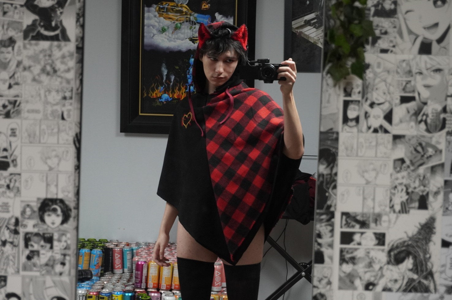 Free Shipping in USDouble layered poncho 100% handcrafted. Half checkered red, and half black design. With gold and red Embroidery of my logo in the top right. Very comfortable and can be worn to shield against rain & wind and worn casually in all seasons. The poncho is equipped with a hoodie, and metal tipped drawstrings. The prestige edition comes with a special handmade logo art on the back, gold drawstring tips, and eyelets. Along with a free pack of stickers, and the Prestige Edition certification metal card.