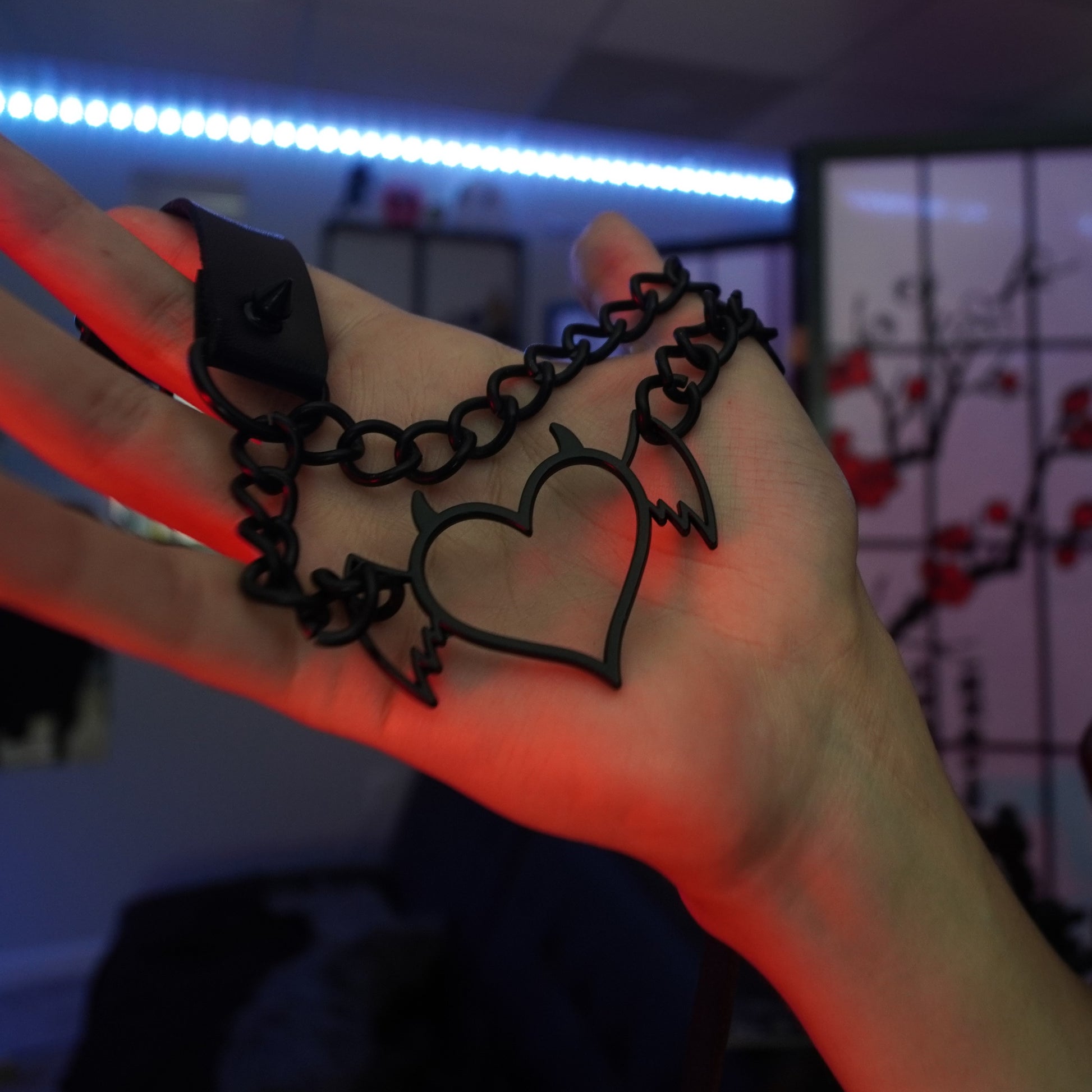 Enhance your accessory collection with a devil choker. With the devil logo centered and hanging down the middle from plated metal chains. Accommodating to all neck sizes, it is perfect for all femboy fits :3